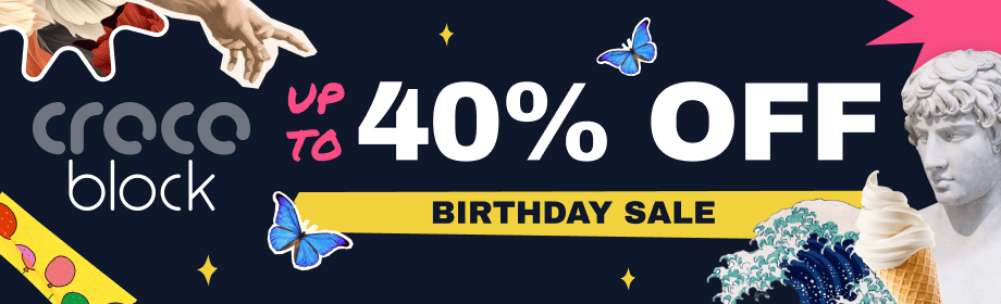 crocoblock wird bald 6 Jahre alt, und um neue Community-Mitglieder willkommen zu heißen, gibt es vom 21. bis 29. Mai eine einwöchige Aktion mit Geburtstagsangeboten.