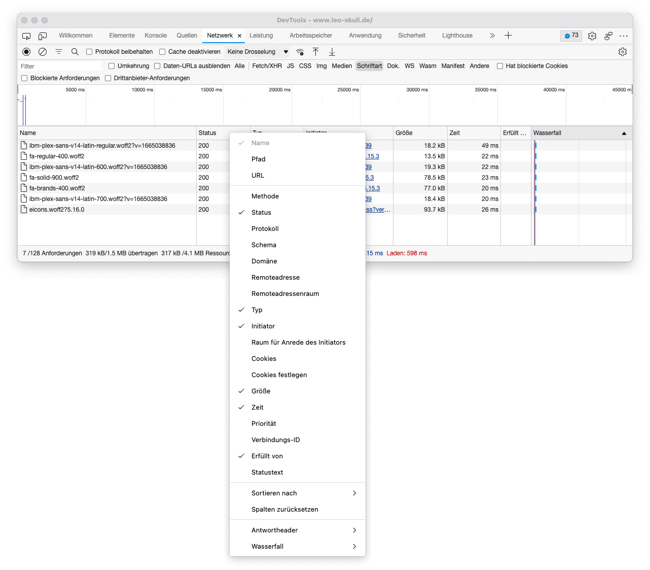 Vertrauen ist gut, Kontrolle ist besser. Auf jeden Fall solltest du prüfen, ob nun wirklich keine Fonts mehr von Google direkt geladen werden. Am einfachsten geht es mit der Entwicklerkonsole, die inzwischen in jedem Browser verfügbar ist (in Safari in den Einstellungen unter Erweitert das Menü „Entwickler“ aktivieren). Mit einem Rechtsklick auf ein Element der Seite das Kontextmenü aufrufen und hier „Untersuchen“ wählen. In der Entwickler-Konsole dann auf Netzwerk gehen, die Seite neu laden und nach Schriftarten filtern: