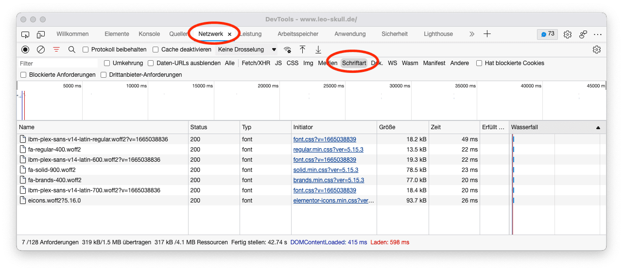 …und schon siehst du auf einen Blick welche Schriften von welchen Servern eingebunden werden – im Idealfall werden jetzt alle Schriften von deinem Server direkt geladen.